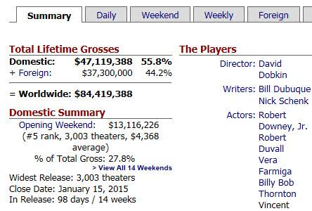 只可惜,《法官老爹》制作成本高达5000万美元(约合3.4亿人民币),上映后却成绩低迷,最终票房仅8441万美元(约合5.7亿人民币),按照院线分账比例,片方都亏懵了,没想到钢铁侠唐尼、奥斯卡影帝也扛不起票房!