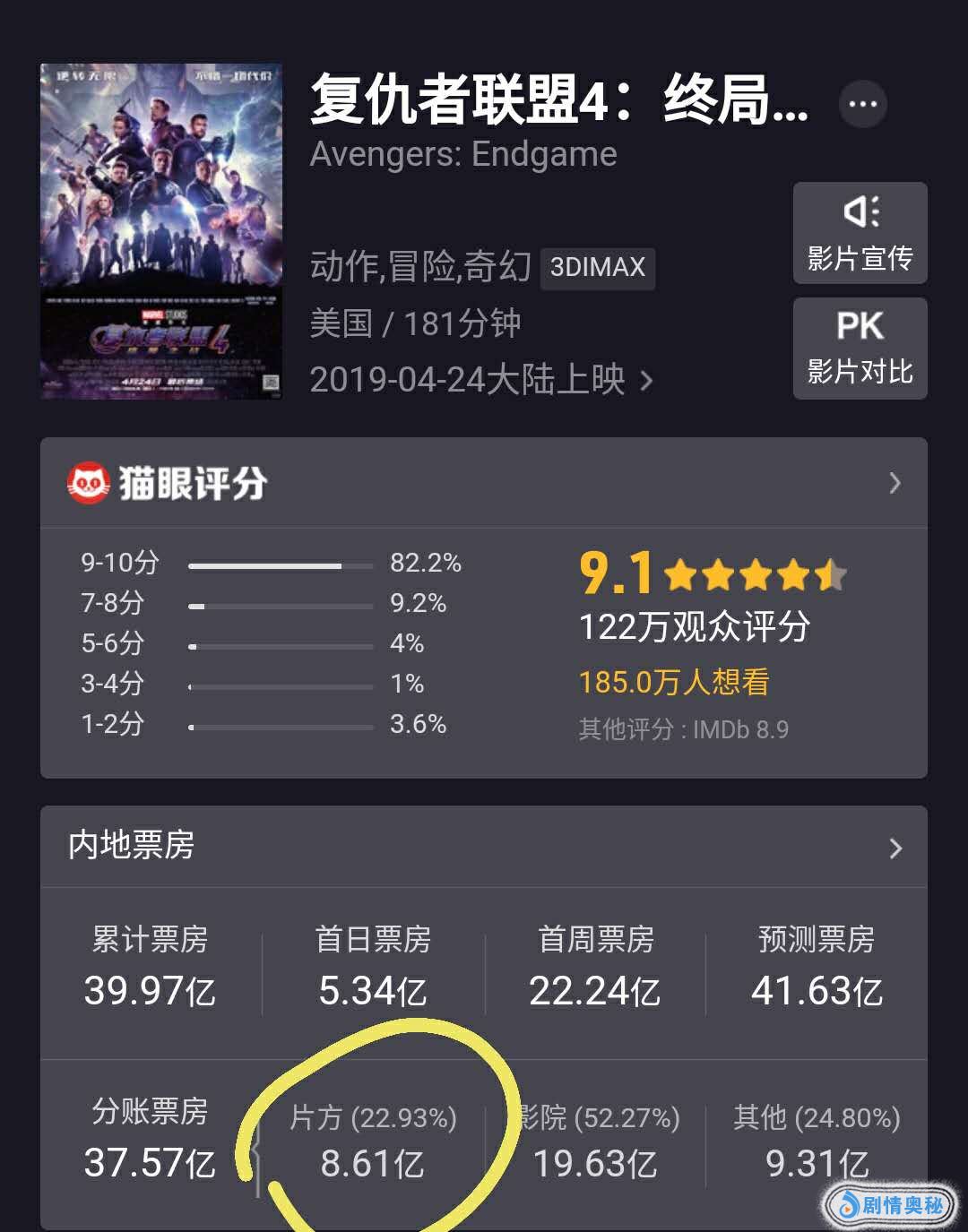 因为是好莱坞进口大片,《复联4》在中国内地的片方分账只有20%多一点,但即使如此,40亿的票房也为金主迪士尼暴赚8个亿!这还不算网络版权收入和其他的周边产品收益。