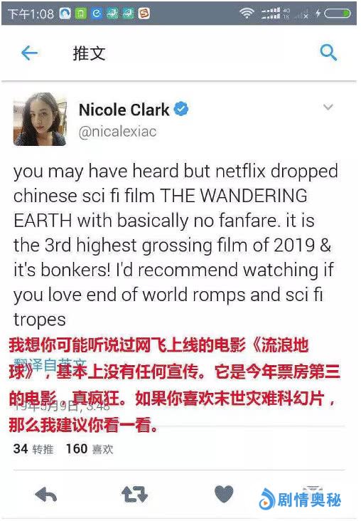 首先是网飞虽然花大价钱购买版权,但几乎是悄无声息的上线,没有任何宣传,包括网飞自己的社交媒体。这是很有趣的一种情况,网飞自己的推特经常会发一些相关影视的视频片段,但确实没发过一条《流浪地球》的。知名媒体人Nicole Clark在社交媒体上推荐《流浪地球》,她写道“我想你可能听说过网飞上线的电影《流浪地球》,基本上没有任何宣传。它是今年票房第三的电影,真疯狂。如果你喜欢末世灾难科幻片,那么我建议你看一看。”