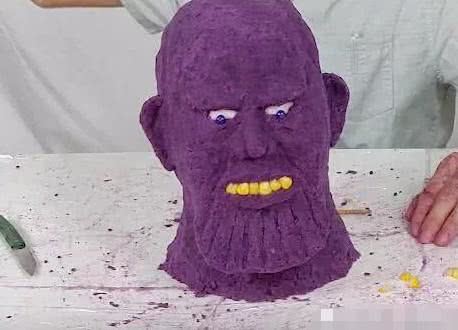 原来这个小伙子将100个紫薯去皮蒸熟,然后将它们揉搓成泥,像极了《舌尖上的中国》。在整个塑造形象之前,小伙子还用上了美工刀以及铅笔,按照狙中灭霸的形象一点一点的塑造。这个过程也是极其认真,不过之后看看呈现出来的作品,这个“紫薯灭霸”怎么还有点萌呢?