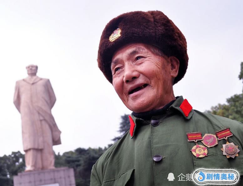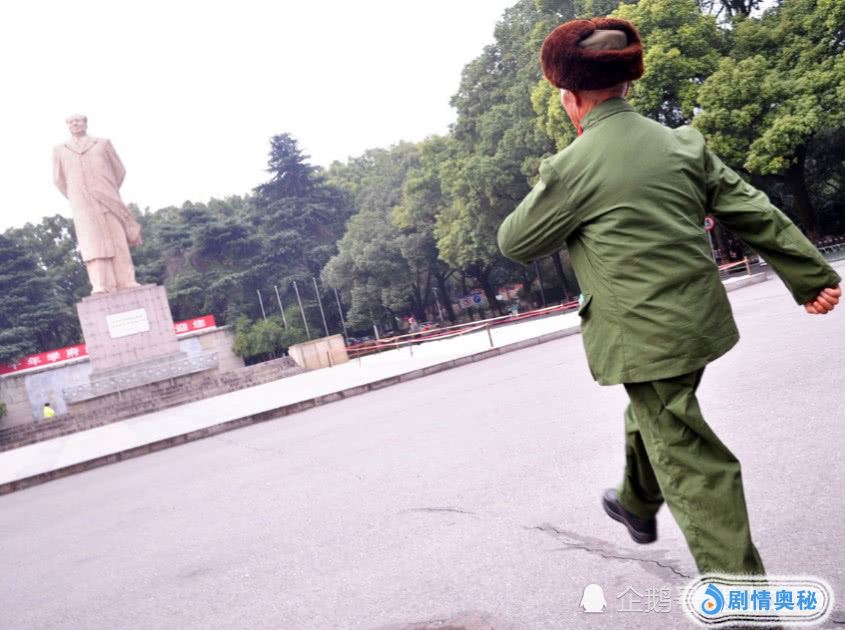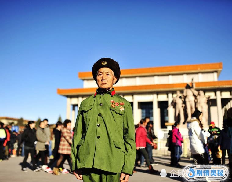 在毛主席雕像前,老人胸前的纪念章闪闪发光,脸上也终于露出了自豪的笑容。