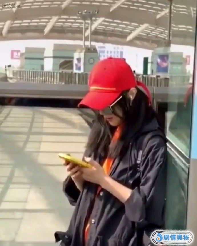 5月10号,范冰冰忠实粉丝晒出范冰冰一组最新近照,头戴红色帽子,身体靠在旁边的玻璃门上,认真低头看手机。