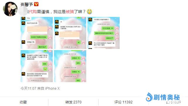 5月10号上午11点,张馨予发文抱怨自己代购物品被欺骗,喊话说代购需谨慎。看完张馨予聊天对话截图,发现张馨予确实被那个代购欺骗了,骗走了6900元。也是可以的,代购都骗到张馨予头上了啊!