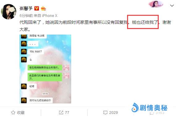 就在刚刚,张馨予发布宣布代购还钱了,她说:代购回来了,她说因为前段时间家里有事所以没有回复我。钱也还给我了,谢谢大家。