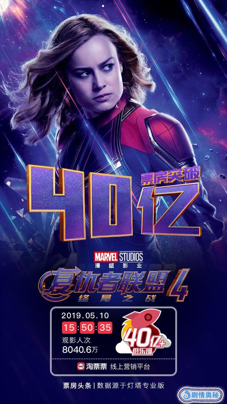 根据淘票票灯塔专业版数据显示,《复仇者联盟4》中国内地票房于5月10日破40亿元!成为中国影史第三部破40亿影片,第一部破40亿的外片。