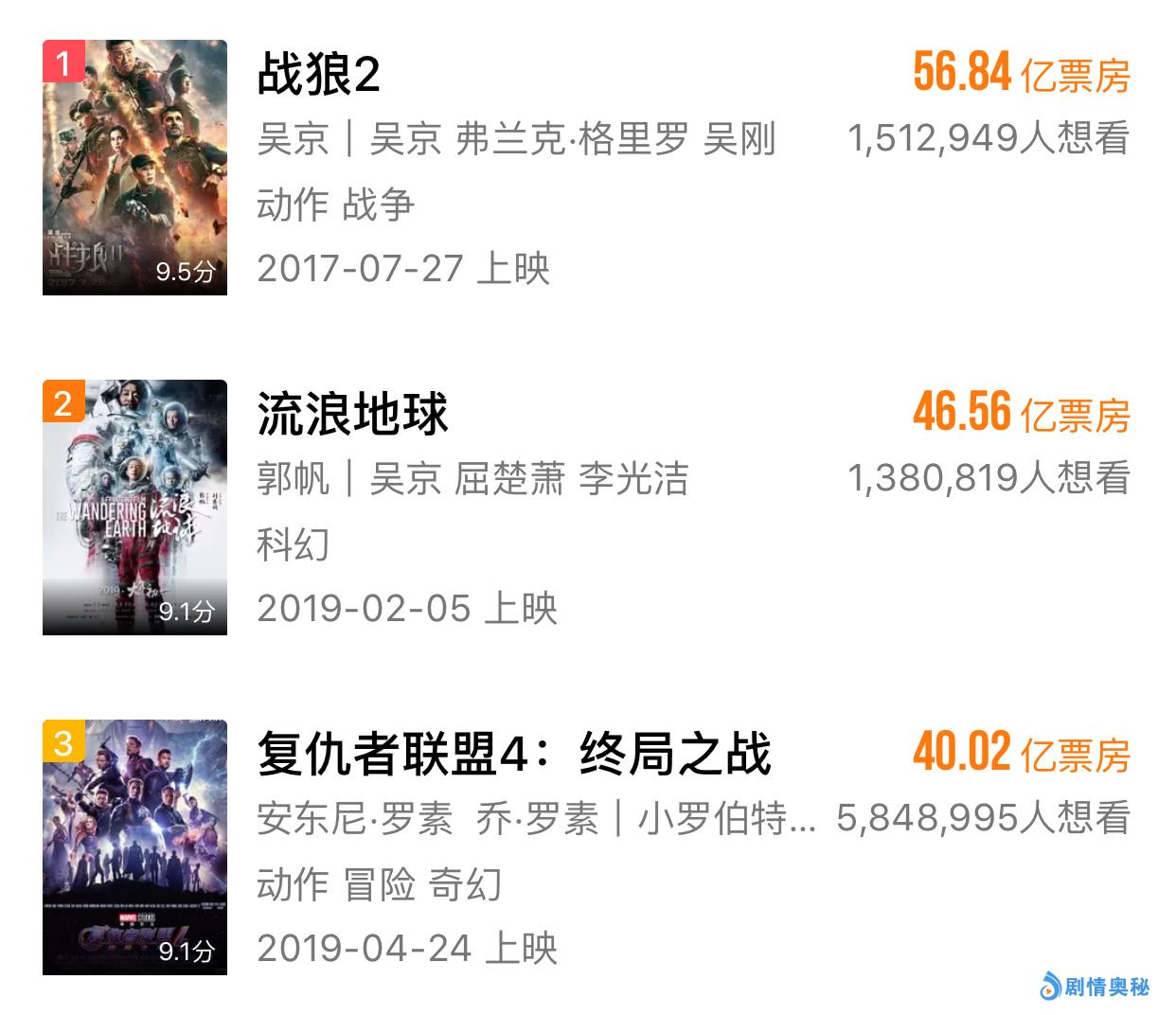 该片上映17天,破40亿用时约16天15小时,慢于前两部40亿+电影《战狼2》、《流浪地球》。截至5月17日,《复联4》的票房累计40.02亿,紧跟在《流浪地球》46.56亿之后。目前来看,《复联4》能否超过《流浪地球》成为内地票房第二,还是个未知数。