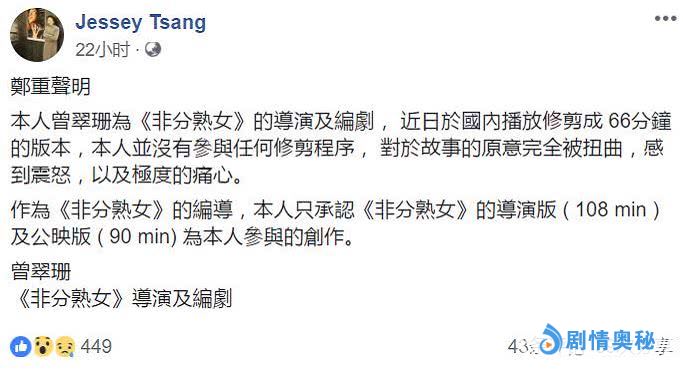 导演曾翠珊怒发声明,强调没有参与任何该版本的修剪程序,大幅度删减造成故事原意被完全扭曲,不承认该版本是自己参与的创作。