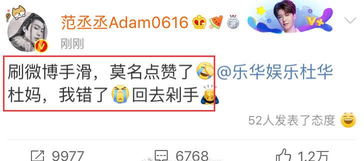 5月10号晚上,范丞丞亲自发文道歉了,表示是自己手滑,莫名其妙点赞了。范丞丞还艾特乐华娱乐杜华,表态说:杜妈,我错了,回去剁手!范丞丞还发了一个哭泣的表情包,向杜妈认错。