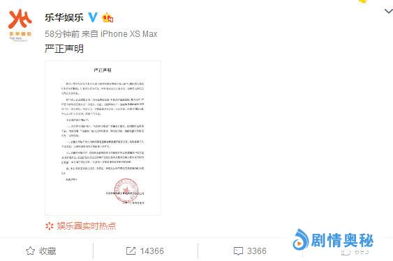 当天晚上,乐华娱乐官博发布声明澄清谣言,声明指出杜华女士发言时一次行业内交流,未提及“呼吁艺人解约全行业封杀”的观点!怒斥有人恶意解读,断章取义,试图散播不良言论,歪曲事实,对杜华女士进行人身攻击。