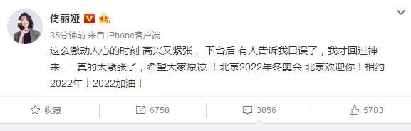 当天晚上,佟丽娅火速发文道歉说:这么激动人心的时刻,高兴又紧张,下台后有人告诉我口误了,我才回过神来,真的太紧张了,希望大家原谅!北京2022年冬奥会北京欢迎你!相约2022年!2022加油! 此前杨超越也出现过类似口误,遭到群嘲。