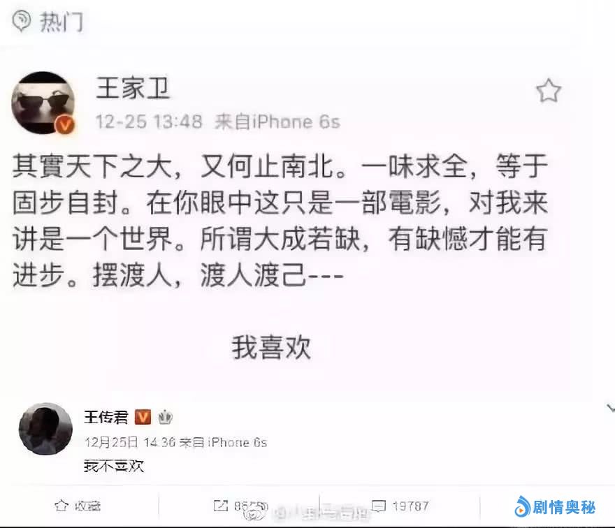 当王家卫的《摆渡人》被众星拱月时,王传君发微博说“我不喜欢”。