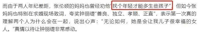 其实二人并未结婚前,张伦硕妈妈就曾嫌弃过钟丽缇,让儿子找个年轻点的女孩才能传宗接代。