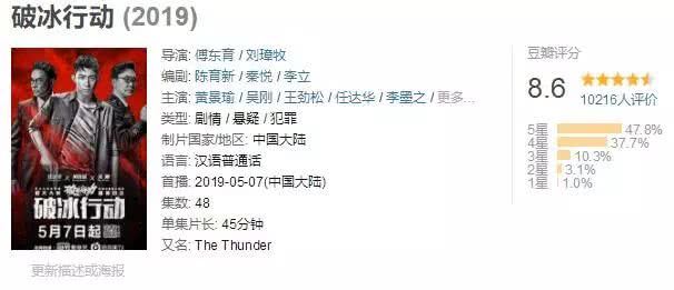 《破冰行动》由黄景瑜、吴刚、王劲松、任达华、李墨之等主演,共计48集,于5月7日开播,刚播出就在豆瓣拿下了8.6的高分。