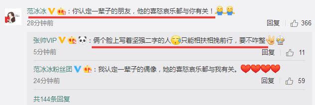 范冰冰给好友张帅留言说:你认定一辈子的朋友,他的喜怒哀乐都与你有关。随后张帅回复:两个脸上写着坚强二字的人,只能相扶相挽前行,要不咋整。范冰冰粉丝团官博力挺:我认定一辈子的偶像,她的喜怒哀乐都与我有关。