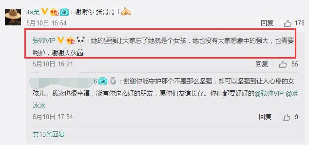 范冰冰粉丝向张帅表示感谢:谢谢你,张哥哥!张帅回复:她的坚强让大家忘了她就是个女孩,她也没有大家想象中的强大,也需要呵护,谢谢大伙。