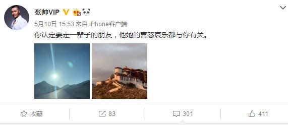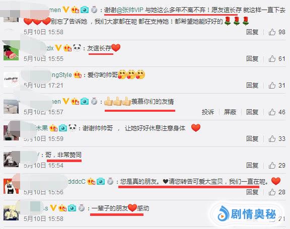 粉丝们都发声说:谢谢张帅与她这么多年不离不弃,愿友谊长存,就这样一直下去!羡慕你们的友情!谢谢帅哥,让她好好休息注意身体!您是真的朋友,请您转告可爱大宝贝,我们一直在!一辈子的朋友,感动。