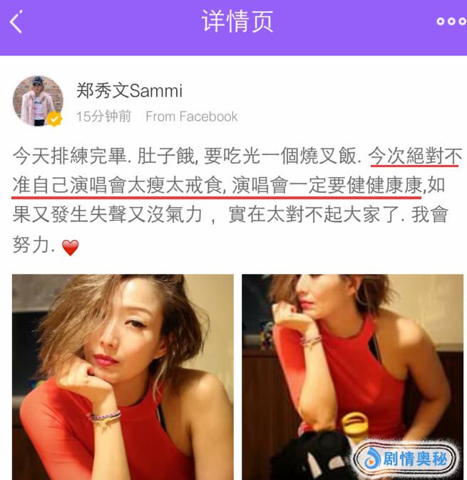 郑秀文也在另一个外网平台发布了消息,她表示今天排练完毕后肚子饿,她要吃光一个烧叉饭。郑秀文表态说:今次绝对不准自己演唱会太瘦太戒食,演唱会一定要健健康康,如果又发生失声又没力气,实在太对不起大家了,我会努力。