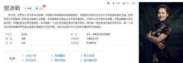 网上资料显示,贺冰新有一长串音乐教育方面的头衔:“世界华人艺术家协会理事、中国音乐学院教育学院客座教授、中国音乐学院社会艺术水平考级通俗教材主编……”