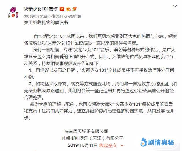 原因很简单,人家开始拒收了。现在的火箭少女,成员将不再接收除信件外任何礼物。如果粉丝非要邮寄、转交赠送礼物,公司将一律拒收并原路退回。