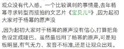 文章里有提到去年杨幂寻找转型接的文艺片《宝贝儿》,称起初剧组对杨幂原声没信心,打算把角色设定为哑巴,最后还是用了原声,称其短板明显,有气无力,发音不标准。该报用词可以说非常一针见血了。
