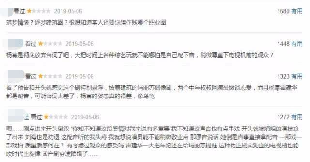 而豆瓣上目前热门评论的前四名,给《筑梦情缘》全部打了一星差评,称杨幂是彻底放弃台词了吧,更有网友表示该剧是披着建筑的玛丽苏偶像剧,两个中年叔叔阿姨装嫩谈恋爱。多名网友对于演员用配音,不用原音意见挺大的。