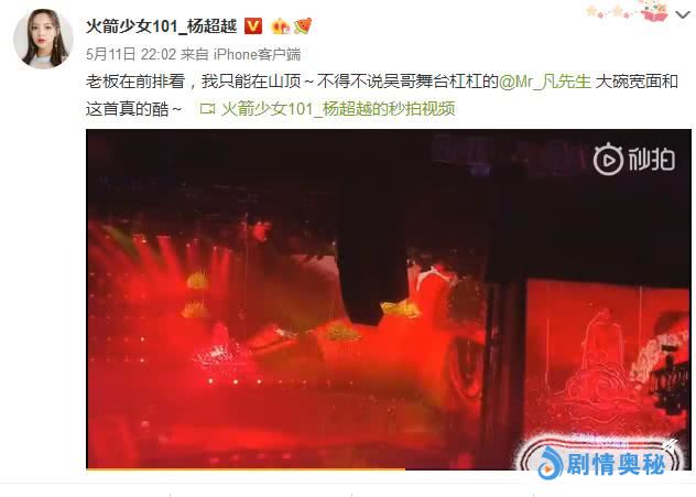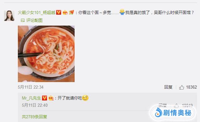 5月11日吴亦凡的个人演唱会北京站吸引了大批明星亲临现场观看,这其中就包括“火箭少女”杨超越,而为了表达自己激动的心情,杨超越还特意更新了一条微博,大赞吴亦凡在当天演唱会上的表现,而就在这条微博评论区杨超越这样写道:“你看这个面多宽,我是真的饿了,吴哥,什么时候开面馆?”