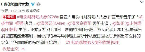 《跳舞吧!大象》是由林育贤执导,艾伦、金春花、彭杨、宋楠惜等主演的喜剧片。5月13号上午,制片方发布首支预告,正式宣布定档2019年7月26号暑期档上映。