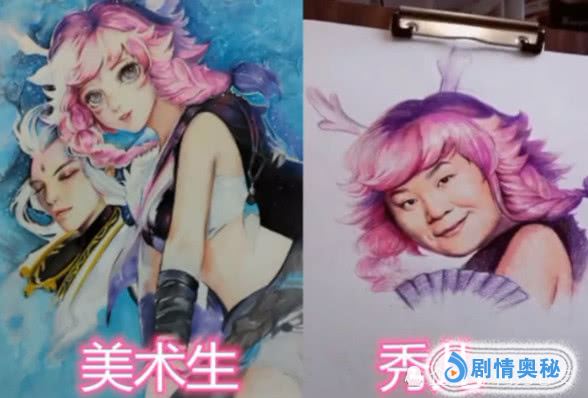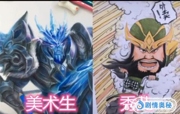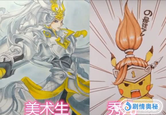 左边的是美术生的作品,右边则是秀儿们的作品,同样都是绘画的英雄,却都是完全不同的风格啊,一个尽力的还原了,一个却是动漫卡通的风格,而且秀儿们也是真的没有愧对秀儿这个称呼!大乔恶搞成了粗犷的汉子,韩信变成了皮卡丘