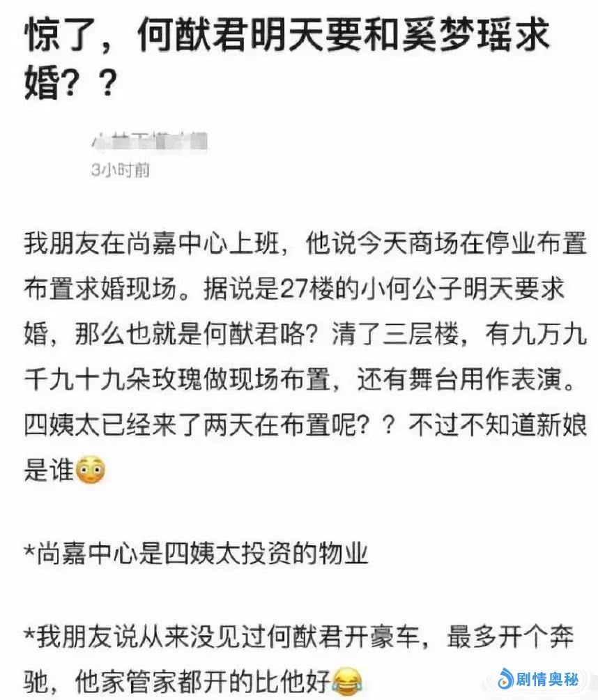 昨晚有网友爆料何猷君将和奚梦瑶求婚,据说何猷君维持清了商场三层楼,准备了九万九千九十九朵玫瑰做现场布置,还有舞台用作表演,这阵仗,也是相当豪派了!