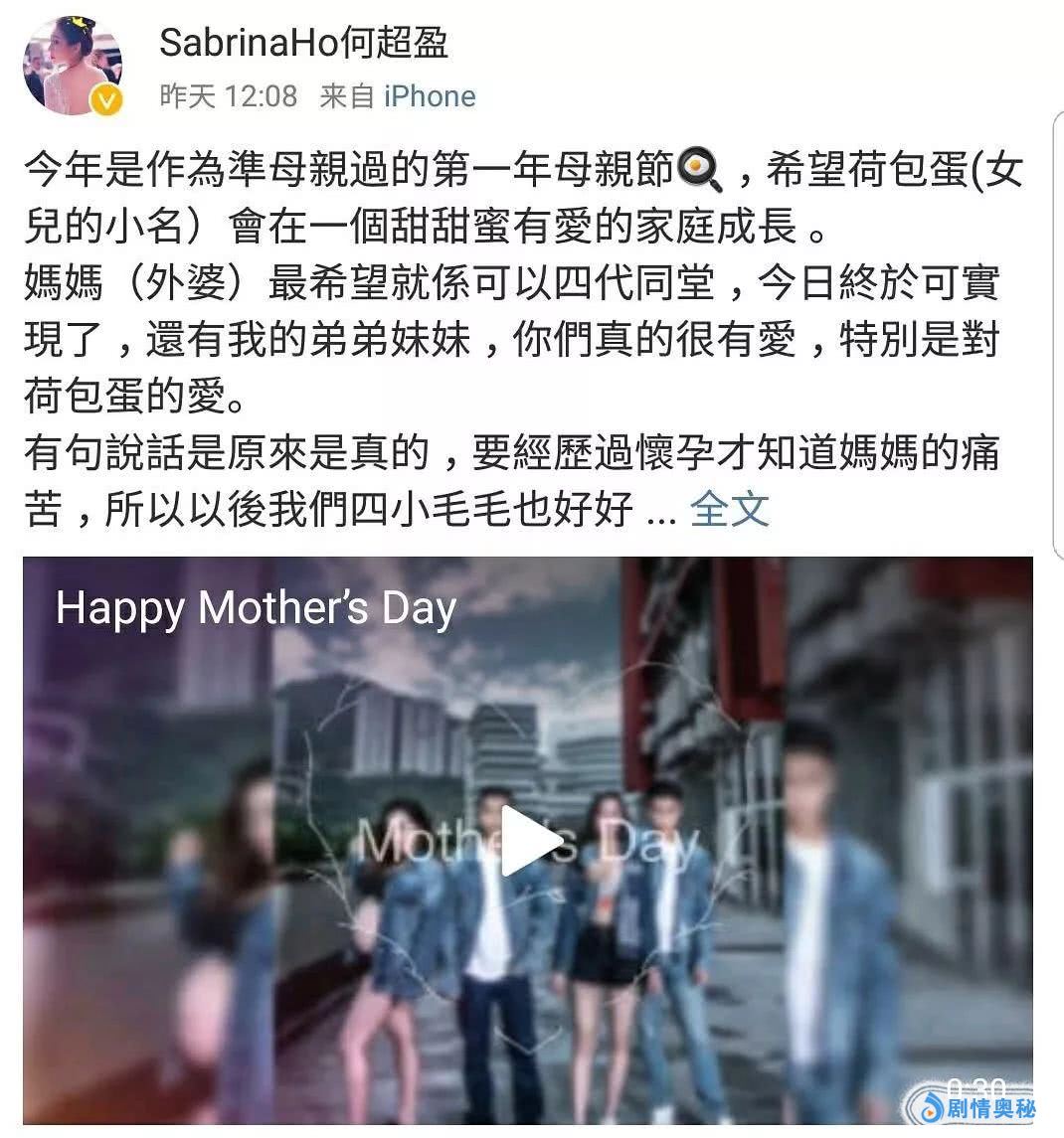 母亲节当天,四房何超盈晒出了大肚写真,官宣自己怀上女孩。