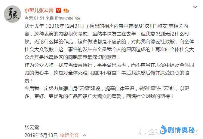 张云雷事件,有人认为道歉了就好,没必要上纲上线。但是,我认为,公开相声表演中,直接拿国难调侃,这比前不久的韩雪“假唱”性质更加恶劣,应该直接封杀!