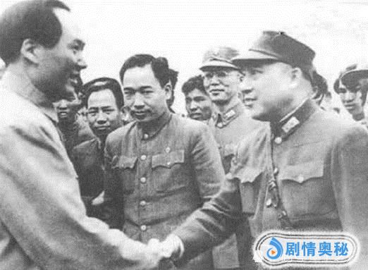 毛主席与到机场迎接的国民党代表周至柔握手。