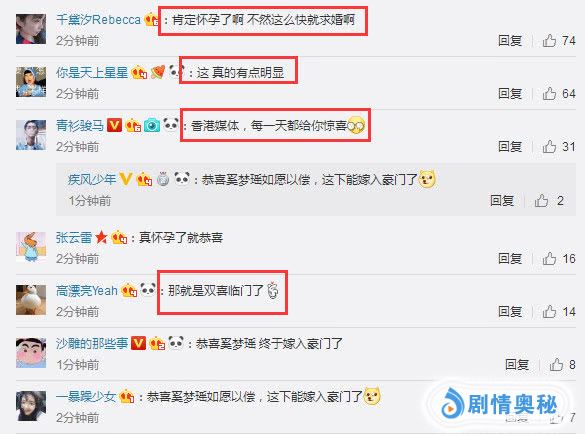 网友留言说:肯定怀孕了啊!不然这么快就求婚啊!这真的有点明显!恭喜奚梦瑶如愿以偿,这下能嫁入豪门了!看来是真的了,怪不得要求婚呢,也算给她一个交待了!如果怀孕了就祝福,不过真正怀没怀还是等官宣!今天的惊喜太多了,这个瓜还等官宣。