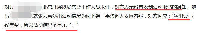 针对各种传闻,记者联系到北京北展剧场工作人员,对方说没有收到张云雷活动取消的通知。记者也联系到大麦网,询问为什么下架张云雷演出?大麦网回复:演出票已经售罄,所以活动信息不显示了。