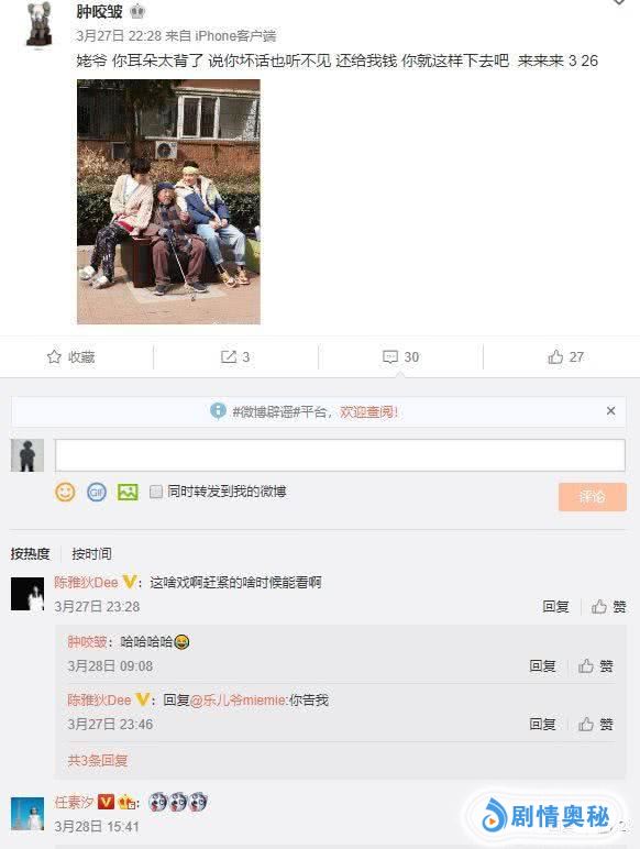 董博的微博名为“肿咬皱“”,他曾发过一张和任素汐的合照。并得到任素汐的“狗头”回复。