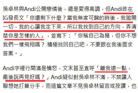 原来事情是这样子的,妻子Andi在外号社交账号发文说:你还剩下什么?当我无家可归的时后,我抛开一切,我的心让我定下来,所以我找到自己的方向,弄清楚你是怎样的人。她训斥吴卓林:你称自己为猪,但你不想我们一样飞翔吗? 积极找回自己吧,不要跟在我后面求答案。笔者问到了火药味!