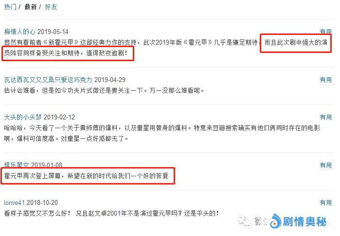 如今,在受2001年版《霍元甲》影响之下,在时隔18年之后,赵文卓再次出演“霍元甲”一角,再次令观众表示期待不已。纵使该剧不是2001年版原班人马,但是此次2019年版《霍元甲》同样得到了观众期待,而且还一度做到了未播先火,赚足期待。甚至在看到演员阵容之后,还有网友一度喊出了熬夜追剧的口号。