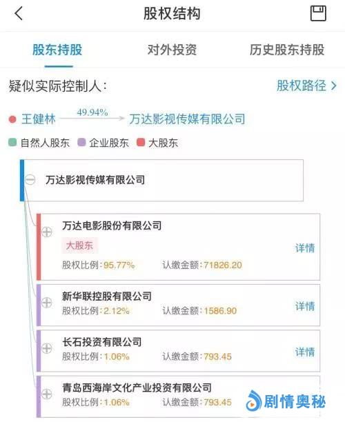 目前,万达电影股份有限公司持有万达影视95.77%股份,为第一大股东,王健林通过旗下公司持有万达影视49.94%股份,为实际控制人。
