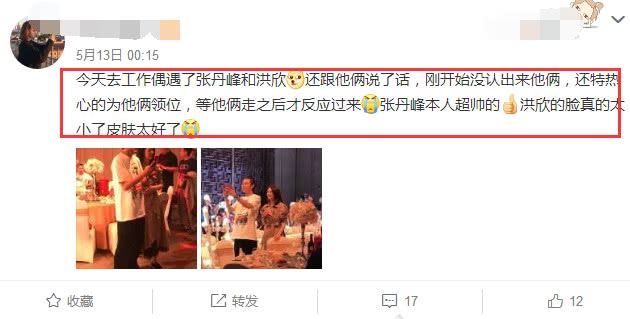 此前,在5月13号凌晨,有网友激动发文:今天去工作偶遇了张丹峰和洪欣,还跟他俩说了话,刚开始没认出来他俩,还特热心地为他俩领位。等他俩走之后才反应过来,张丹峰本人超帅的,洪欣的脸真的太小了,皮肤太好了。据悉,洪欣张丹峰合体去哈尔滨参加了婚礼。