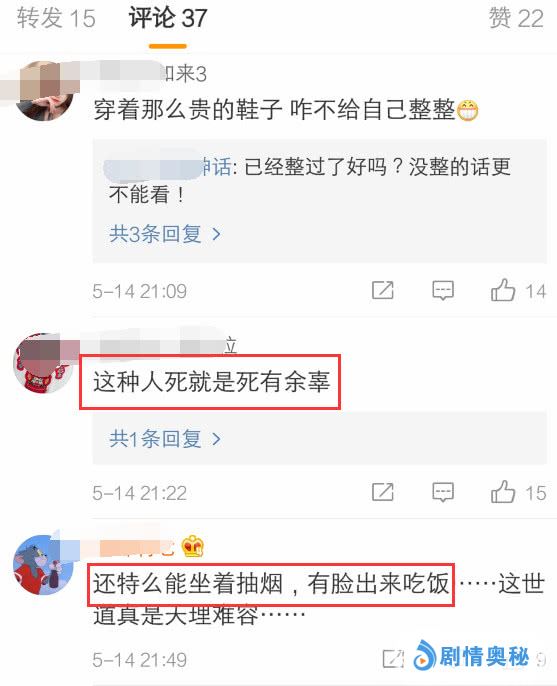 吃瓜群众都在抨击说:穿着那么贵的鞋子,咋不给自己整整?这种人死就是死有余辜!还特么能坐着抽烟,有脸出来吃饭?这世道真是天理难容!居然敢不戴帽子口罩墨镜,难道不怕被吐口水吗?东北掰蒜小妹!抑郁?受害者?真的是又矮又黑还长得不好看。