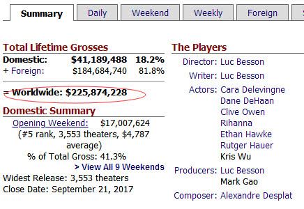 只可惜,《星际特工》全球上映后,票房表现相当惨淡,全球票房仅2.25亿美元(约合15亿人民币),扣减院线分成后亏损已破亿美元,甚至成为2017年亏损最严重的商业大片,片方亏懵了,没想到吕克·贝松也扛不起票房!