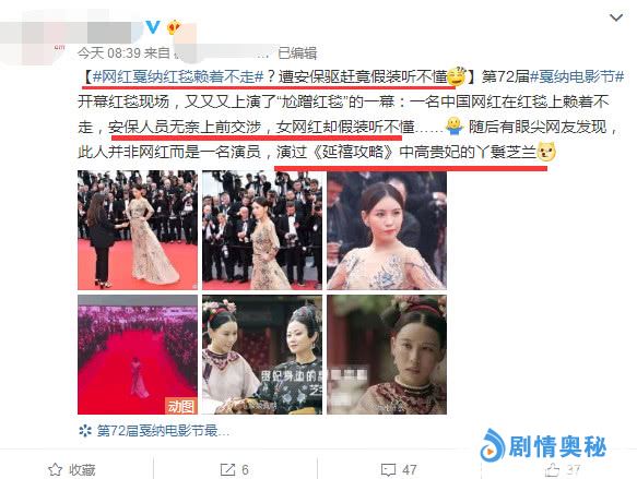 随后她的身份被曝光了,不是女网红,而是一个不知名的小演员,演过《延禧攻略》中高贵妃的丫鬟芝兰。哈哈哈……毯星丫鬟就这么横空出世了!