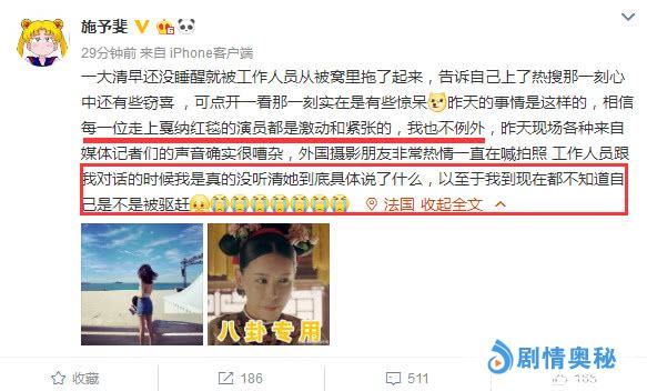 5月15号下午,施予斐发文说一大早没睡醒被工作人员从被窝拖出来,点开热搜有些惊呆,她表示相信每一位走上戛纳红毯的演员都是激动和紧张的,承认说自己也不例外。