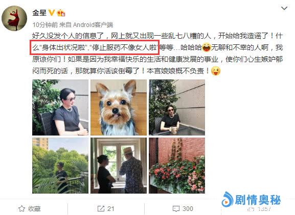 5月15号,金星晒出了老公汉斯视角的照片,她身穿黑色短讯长裙,戴上墨镜,嘴唇鲜红,以一个十分精致的妆容与大家见面。金星说:好久没发个人的信息了,网上就又出现一些乱七八糟的人,开始给我造谣了!什么身体出状况啦,停止服药不像女人啦等等,哈哈哈,无聊和不幸的人啊,我原谅你们。