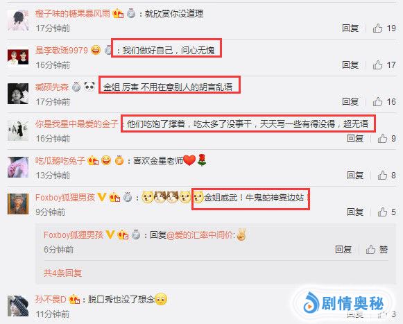 金星粉丝支持说:堵住他们嘴的最好办法,就是过得比他好,活得比他精彩,支持金老师!我们没有变,只是我们都想念金老师的金星秀了!金老师盘他,盘他!我们做好自己,问心无愧!金姐厉害,不用在意别人的胡言乱语!他们吃饱了撑着,吃太多了没事干,天天写一些有得没得,超无语!金姐威武,牛鬼蛇神靠边站。