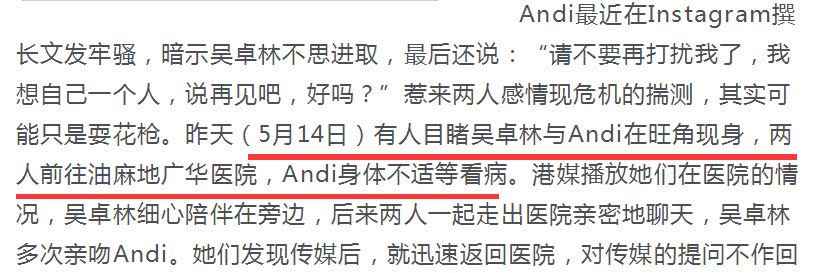 Andi曾经公开发文说:请不要再打扰我了,说再见吧,好吗?外界猜测吴卓林婚姻泡汤,可能被妻子Andi抛弃。但是就在5月14号,吴卓林和Andi一起现身某医院,据悉Andi身体不适来医院看病,吴卓林特意陪她去的。期间吴卓林多次亲吻Andi,秀恩爱,两人感情疑似升温,极有可能是再次复合了。