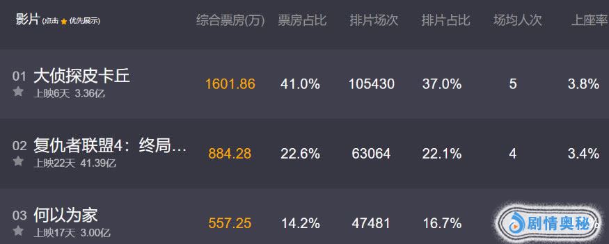 5月15号萌萌的皮卡丘依然拿下了内地日票房冠军,但票房数据并不好看,截至21点《大侦探皮卡丘》日票房为1600万。排片占据了37%,票房占比41%。上座率不敌口碑神作《何以为家》