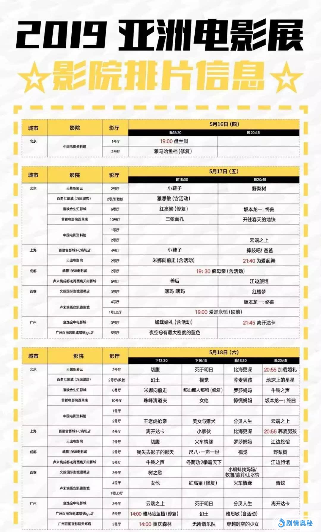 以“文明之光,银幕绽放”为主题的“2019亚洲电影展”已于2019年5月13日全面开票,网络售票平台为淘票票和猫眼。