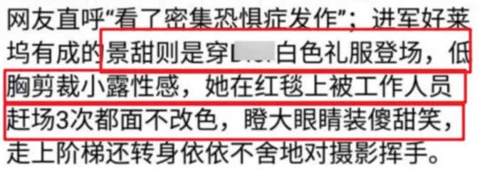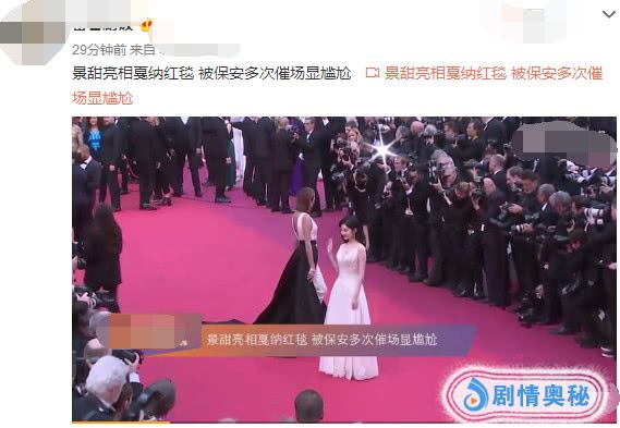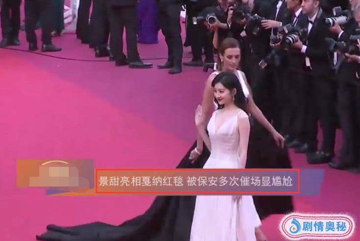 这位男保安向景甜作出一个勾手的手势,一个劲催促景甜。据媒体报道,景甜被工作人员赶场3次都面不改色,媒体还用“瞪大眼睛装傻甜笑”来形容景甜。