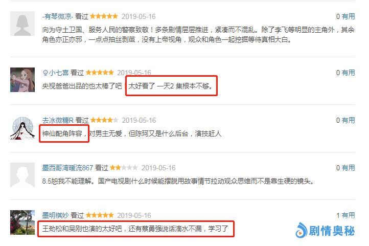 总而言之,在从5月7日该剧热播后,一直追剧至今,真心说一句:良心剧!除了是根据真实故事改编,剧情紧凑,没有任何拖拉和犹豫,而且每一处的场景都处理得很细心,车祸的场面也很真实,以及场景的布置相当吸引眼球。同时强大的演员阵容也一度程度上赚足观众期待值。甚至随着剧情发展,剧中蔡永强在接受调查组调查,回答“你怎么评价,你和禁毒大队的?”时说的那一番话语,简直令人心生敬畏和佩服。